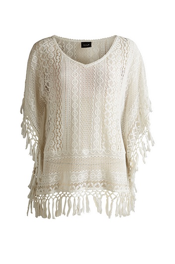 Trendiga fransvästen och coola ponchon/tröjan kostar 379 kr. Härliga vida byxan och tunikan/klänningen i samma serie kostar båda 349 kr.