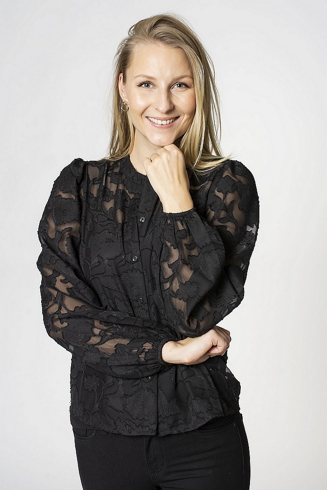 Den svarta blusen kommer även idag och är transparent med fint sytt blommönster. Maria har svart linne under här men vågar man så är den riktig snygg till bara svart bh och hög kjol eller höga byxor.