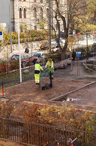 Fredag och strålande sol i Göteborg. Hela morgonen har det varit konstant borrande o dyl utanför skolan som ligger mittemot Mandel. Till slut tystnade det och kolla vad jag såg när jag tittade ut genom fönstret då... två arbetare som gungar på skolgården. Ha ha ha fredagskänslor som sagt!