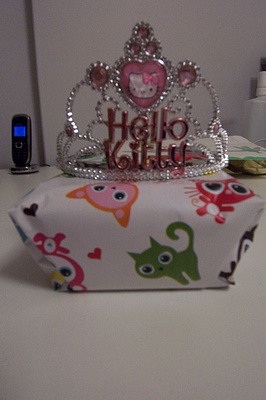 I morgon ska lillkillen på kalas så jag har precis slagit in paketet och toppat med (enlig mig) något alldeles underbart - en Hello Kitty-tiara. Jag vill också fylla 3 år... kan ju tillägga att jag i dag var inne hos Malin på Prickig Katt och gav henne en likadan Hello Kitty-krona och där blev det slagsmål (=P) vem i personalen som skulle få ha den på sig...