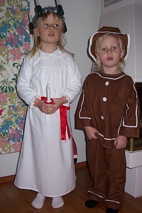 Ja idag gick vi upp mitt i natten (enligt mig... 06.00) för att barnen hade lussefirande på dagis kl. 07.00. En pepparkaksgubbe och en lucia blev det den här gången. Mysigt att se alla sötnosar stå där och försöka sjunga någorlunda i takt (ett barn körde sitt eget tempo = liiiite före alla andra =D) och komma på orden till alla julsångerna. Förra året sjöng vår dotter om "Jesus Kvist"...