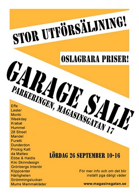 Nästa lördag = 26/9 då smäller det... Då är det åter dags för vår stora Garage Sale som vi har två gånger om året tillsammans med massa butiker i vårat underbara område!!! Här ser ni alla som kommer att vara med i år. Ni som varit med tidigare vet att här är det verkligen lätt att göra galet bra kap ;P Våra plagg säljs för 60 - 200 kr och nu har vi MASSOR av plagg som ska bort denna dag!!! Rött kryss i almanackan nästa lördag alltså: 10-16 kör vi. Ses då =D