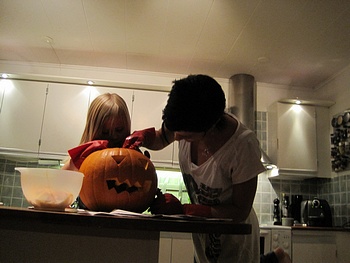 Bild från i söndagskväll då vi skar ut årets pumpa och tog hand om allt slemmigt innehåll till barnens skräckblandade förtjusning...