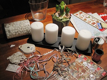 Jag sprang runt i lite olika affärer i dag och köpte lite smått och gott för att kunna göra min alldeles egendesignade advents"ljusstake" i år... Efter en hel del klippande och knåpande så är jag nu klar... och känner mig rikitgt nöjd =D I morgon ska jag fortsätta pysslandet tillsammans med barnen då jag tänkte vi skulle använda lite fina gammeldags tomtebokmärken, vita fjädrar, papper med vackra texter m.m och göra lite fina små hängen som man kan dekorera både hemmet, julgranen eller julklapparna med ;P