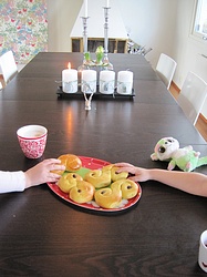 I dag blev det advenstfika med smarriga lussebullar efter frukost till barnens stora glädje ;P Nu ska jag göra lite annorlunda advenstsysslor... kratta löv och slänga äpplen från träden, in med grill och utemöbler - det är väl läge att få gjort detta innan jul eller ;P
