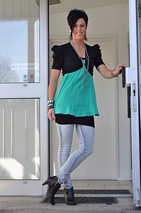 Ny härlig vecka och solen skiner i dag igen - såååå härligt =D I dag är Julia ledig så jag jobbar hela dagen i butiken i stan, nu ska jag snabba mig här med dagens texter så jag hinner ner till stan så jag hinner städa innan öpning kl. 11. Jag har på mig "raw"-leggings, "officiel u-neck" sköna linnet "dana" och "boleron "danish" (som kommer in igen i veckan).