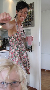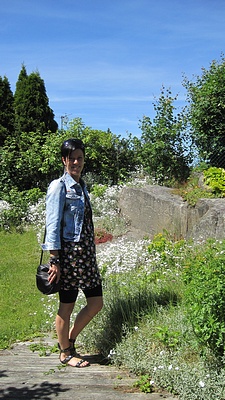 Nu är Kalle på väg hem för att vara med dottern medans jag åker in till butiken för lösa av Lotta så hon får sin lunch. Jag har på mig "nedita" cykelbyxor, nya klänningen "mini lisa" och jeansjackan "noli". Om ni tycker fotot ser knasigt ut så beror det på att jag använt självutlösaren och kameran står på en stol som står staplat på utebordet... ha ha ha vad gör man inte för att ge er en dagens ;P