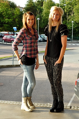 Emmelie har på sig "Funky Fair", "Officiel long tank" och skjortan "Pilut Check Shirt". Evelina har på sig haremsbyxorna "Rico" och toppen "Cooper Top". Tjejer har även tagit det nya halsbandet "Jaime" som kommer upp med dagens plagg kl. 11 idag ;P