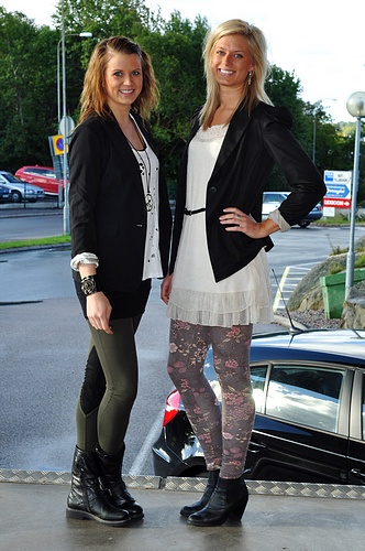 Emmelie har på sig kavajen "Tott", "Officiel linne" och över har hon linnet "Holes Tank Top", leggingsen "Telyn Zipper Legging" och det nya armbandet " Delilah" som kommer upp idag. Evelina har på sig kavajen "Ranie Blazer", tunikan "Enna", skärpet "Kreo" och de blommiga leggingsen "Blomst Leggings"
