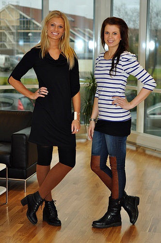 Evelina har på sig nya "Felula Dress" som kom upp idag. Hon matchar med "Nikoline Tights" och knästrumporna "Bob Knee High". Emmelie har på sig "Funky Unika", "Officiel Long Tank" och toppen "Denna".