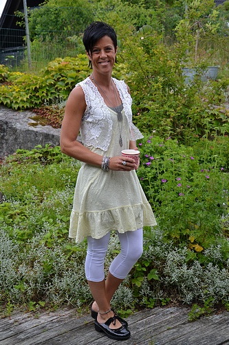 Jag har på mig sköna tunikan "Hera Jersey Tunic", "officiel"-linne under, västen "afia" ochleggingsen "edita 3/4".