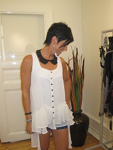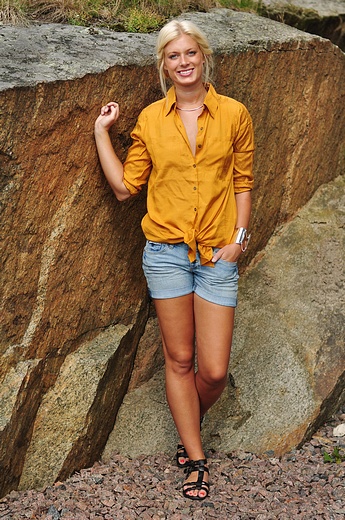 Evelina har på sig tunikan "Lotas Tunic" som finns på rean och under har hon shortsen "Funky Highwaist Shorts 2" och mobilväskan "Prima Leather Phone Bag" ;P