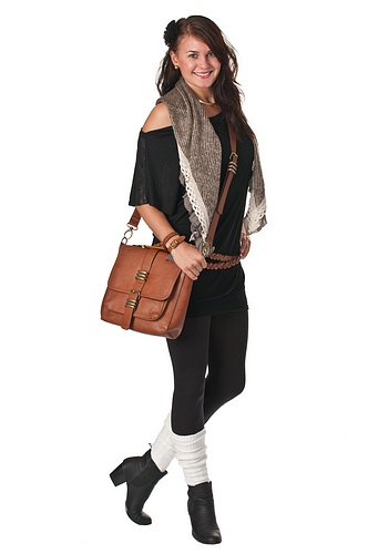 Hon har på sig "Berlina Top", "Blondon Leggings", "Helena Knee High", "Hogan Earrings", Ronja Brooch", "Villsi Leather Belt", "Dertan Bag", "Patti Scarf" och "Electra Must Necklace".