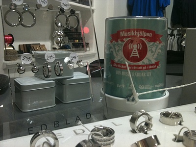 I år sänder P3 programmet "Musikhjälpen" från Göteborg så jag var nere nu på lunchen och skänkte två kassar med vantar och passade även på att registrerade mig för en insamlingsbössa som jag gick runt och skramlade med. Nu står bössan här på kassadisken i butiken så jag hoppas Göteborgskunderna fortsätter att skänka pengar till insamlingen, på lördag ska jag lämna in den och då hoppas jag kunna lämna in en välfylld bössa (den är nästan halvfull redan nu så det ser lovande ut).