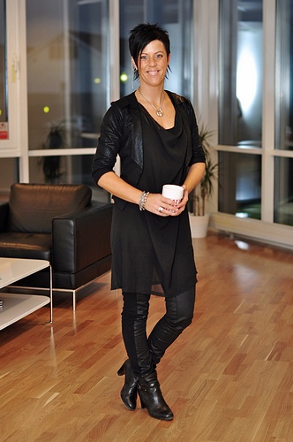 * Therese har på sig skjortan "Linn", linnet "Officiel Long Tank", strumpbyxorna "Kental" och nya koftan "Deanna".