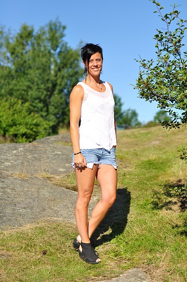 Jag har på mig jeansshortsen "kalto", "live love strap" och nya linnet "liskas".