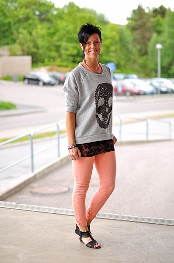 Jag har på mig sköna "funky highwaist leggings denim", spetslinne från Vero Moda och nya coooola döskallletröjan "bian".