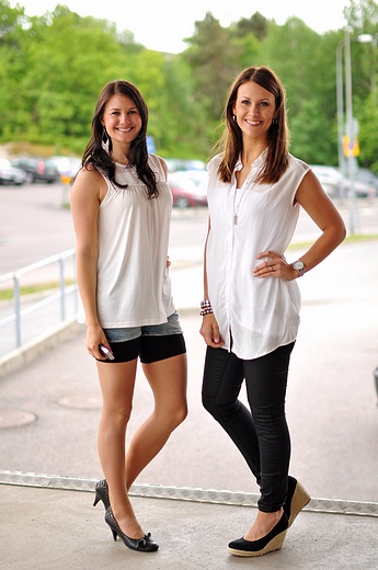 Stackars Fanny ligger tyvärr hemma och är sjuk i dag så ni får hålla till godo med Therese och Joline här idag ;P * Joline har på sig nya fina toppen från Vero Moda (179 kr, kommer i svart och vitt), jeansshortsen "devana" med cykelbyxorna "london" under. * Therese har på sig nya fina ärmlösa skjortan med spetsdetaljer upptill som ni bara inte får missa "kate" och coola byxorna "olivia biker zip" som vi nu har några få kvar av.