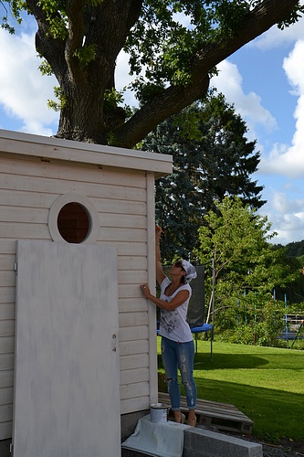 Vi har ju som sagt fullt upp med massa utomhusprojekt hemma då vi vänt upp och ned på halva trägården och uppfarten det senaste året;P När jag var på Öland så monterade Kalle ihop vår friggebod som jag nu grundmålat knutarna m.m på i dag medans Kalle fixat det sista med taket;)