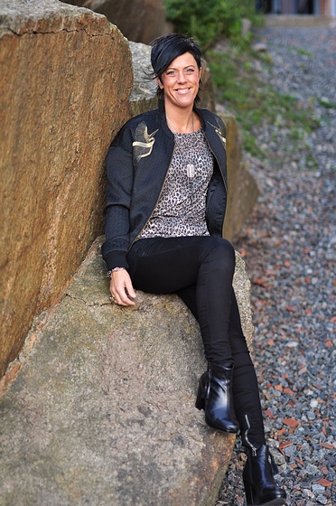 Jag har på mig underbara "nanna"-byxorna som snart kommer in igen (jisses vad de sålt snabbt varje gång vi haft dom inne), "leopold"-toppen som kommer i dag, "live love lace"-linne och coooola jackan "bomber jacket".