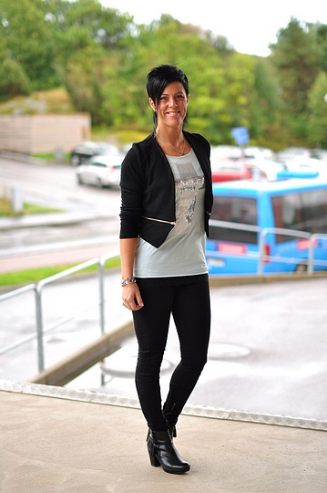 Burrrr ja nu är höstkylan här så man var allt lite småfrusen efter dagensfotot här;P I dag kommer den här fina boleron/kavajen med de glittriga detaljerna över axlarna som jag själv längtat sååååå efter;) Jag har på mig de grå "Funky HW Legging Denim 2", "officiel"-linne, "izumi" och "lorine".