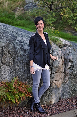 Jag har på mig underbara "nanna"-byxorna som är på väg in till oss vilken dag som helst, "live lve lace"-linnet, nya toppen "pernille" och kavajen "bharlene".