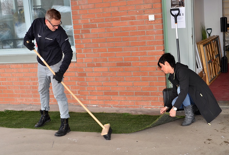 Ja i dag har vi otur för det har snöat i natt så Kalle fick åka iväg tidigare till webshoppen och skotta hela uppfarten och nu täcker vi med konstgräs där kunderna ska gå så vi inte får en hel sörja av vatten och slask inne i lokalen när vi drar igång här kl 11:00.