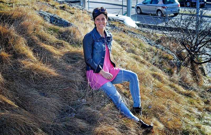 Jag har på mig sköna "Funky Fiesta"-jeansen med hål som vi ännu har kvar några av, nya fina "new Jihna"-toppen som kommer i dag och favvojackan "Chris" som ni väl inte kunnat missa nu;P
