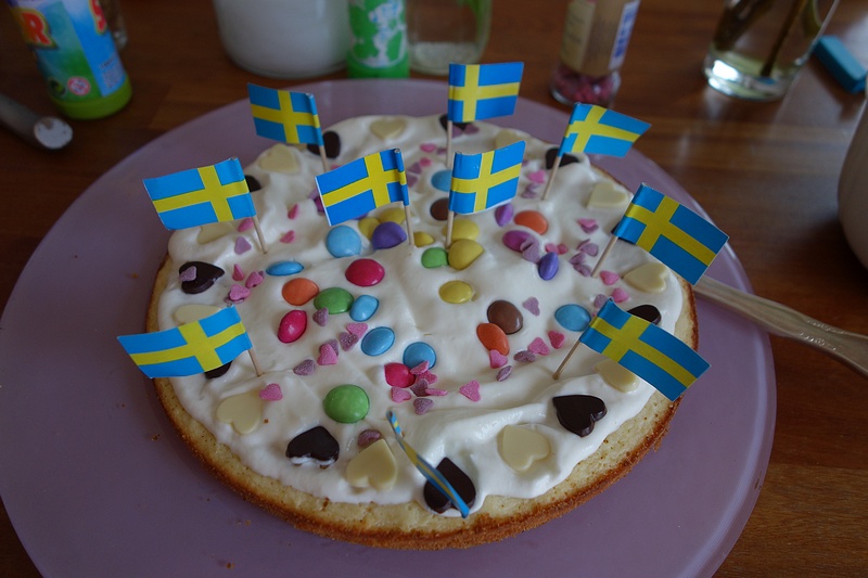 Ja dotterns tårta gick hem i år så nu vet jag vad jag kan göra till nästa år;P Den blev dock väldigt tunn så jag kanske gör en dubbel sats nästa gång men nu valde jag att lägga grädde och dekorera den så man fick mer tårtkänsla och till detta hade vi blåbär och hallon som blev supergott=) Nu laddar vi om till eurovison här, ska ni se den också?