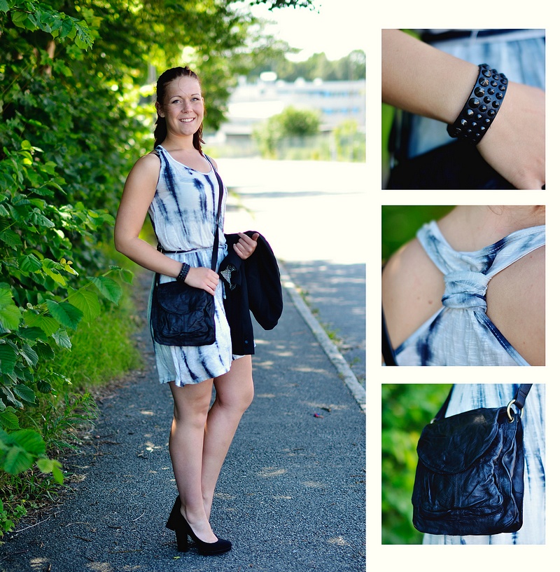 * Sofia har på sig den trendiga och luftiga batikklänningen "Maria". Över armen har hon "Morgana Blazer" som är en perfekt baskavaj. Väskan heter "Odell" och armbandet är tuffa "Ave Leather Bracelet".