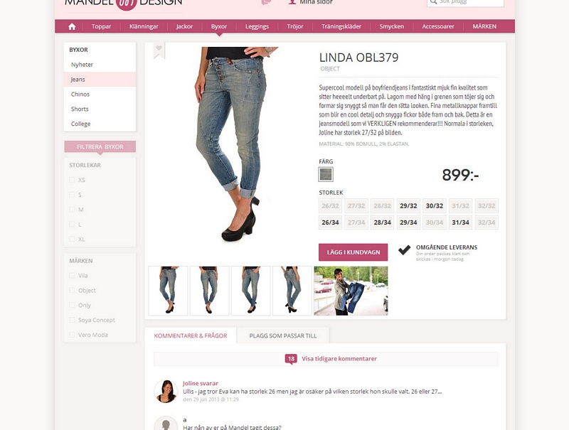 Det kommer finnas små färgrutor som visar de olika färgerna (även om det här exemplet bara har en färg). Klickar man på färgrutan så visas också rätt bild till färgen. För varje färg visas vilka storlekar som produkten kommit i och de storlekarna som finns på lager visas med mörkare text. Har vi har en bra bloggbild där plagget är med så kommer den visas här. Materialinformationen visas utan att man behöver klicka på något. Nedanför så visas två flikar, den ena med alla kommentarer och den andra med plagg som passar till. /Kalle
