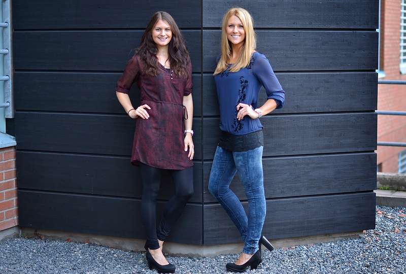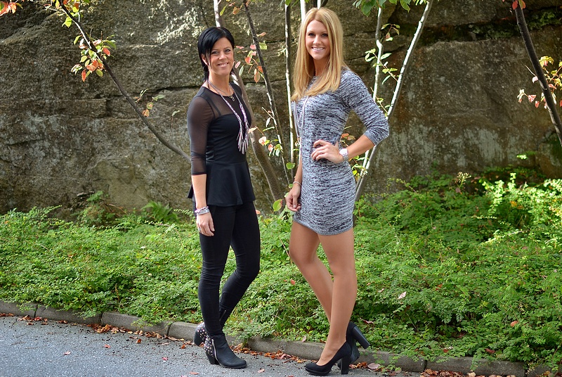 *Jag har på mig fina toppen "Georgia" (som jag redan norpat själv) och suveräna "Nanna"-byxan. * Therese har på sig suuuperfina Vila-klänningen "Mel" som kommer i dag och fina halsbandet "Adia".