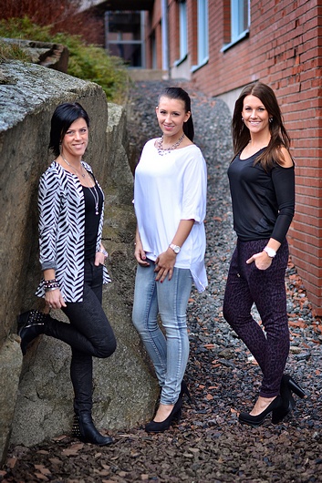 Ja det är mycket fint som kommer in i dag som sagt så här får ni lite inspiration från oss, kolla tex på nya superfina Edblad-halsbandet som Jennifer har på sig. * Jag har på mig "Ikom"-koftan, "Officiel"-linnet och "Funky"-byxan. Smyckena är favoriten "Älskad Ankar" med strasspärlan som hänge och idag blir det äntligen påfyllningen på dessa smyckena som jag vet att många av er väntat på. * Jennifer har på sig coola Vila-toppen "Swedi" som kommer (i svart och vitt) idag, byxorna är sköna "Funky Deva"och halsbandet nya "Dank" som också kommer i dag. * Therese har på sig snygga "Canta"-byxan som kommer i dag och trendiga Vila-toppen "Rilakka".
