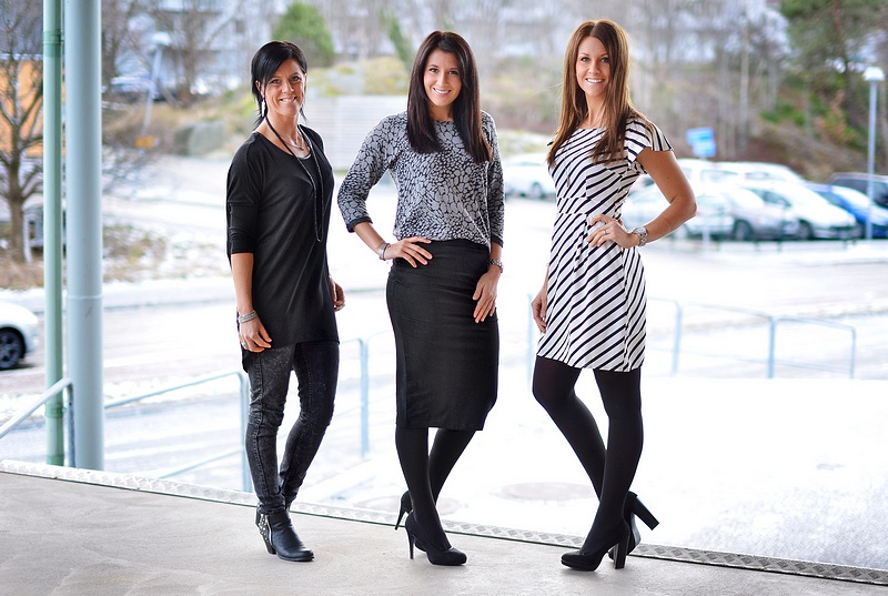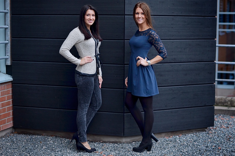 Ja här står vi med ett liiiitet vitt snötäcke bakom oss så nu har vi fått första snön här också=) * Jag har på mig nya fina oversizetoppen "Essie PU" som kommer i dag, byxorna "Just Jute Snow" och halsbanden "Faith", "Heart/Star" och "Filla". Örhänget är favoriten "Devi" som sålt slut igen men som snart kommer in här. * Jennifer har på sig "Wansel"-tröjan och "Live Love Calf"-kjolen som bägge kommer i dag. Strumpbyxorna är suveräna "Edna" som värmer gott nu då de är med fleecefoder. * Therese har på sig fina klänningen "Emma" som kommer i dag (i flera olika mönster) och fina "New Nikoline Tights".