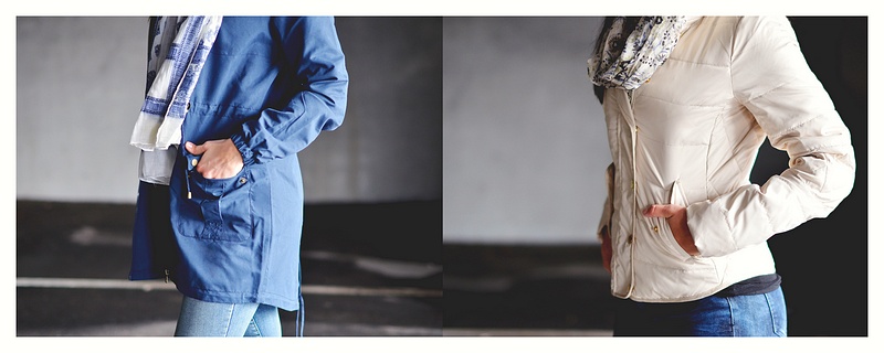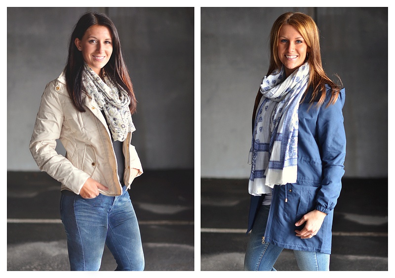 *Jennifer har på sig "Macro Spring"-jackan som känns fräsch i fin cremefärg, och till den passar härliga sjalen "Shima" perfekt. *Therese har på sig nya jackan "Moody" i cool parkas-modell med sjalen "Senna" i blått. Byxorna är sköna jeansen "Cleavo 5 P-163".