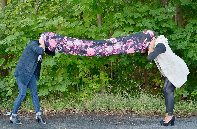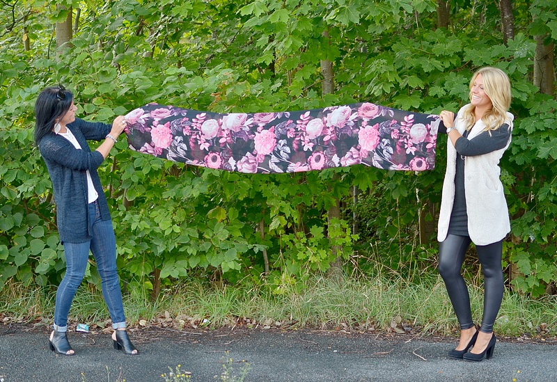 Ja massa fina höstplagg kommer i dag och som sagt här ser ni smågalna bilden på mig och Therese när vi försöker visa er att dagens sjal liksom är ihålig så den går att ha både som tubsjal och vanlig avlång som jag har på översta bilden. När man har den som tubsjal så trär man den bara över huvudet så ligger den perfekt direkt - sååå himla smart verkligen=)