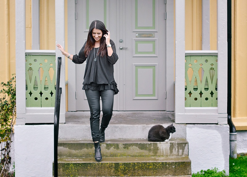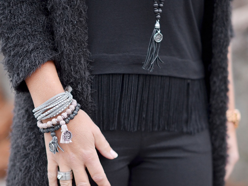 Jag har på mig nya ajlajk-smyckena som jag redan norpat själv, nya tishan "Vmfiona" med fransarna nertill som kommer i dag, storsäljaren "Perfect"-koftan och "Lo 7/8".