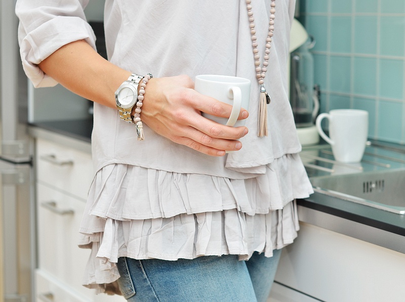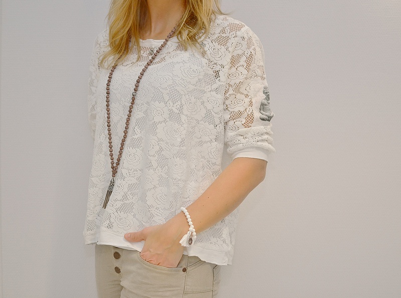Här visar Therese underbara spetstoppen "A254" och suveräna "Objliva Canvas"-byxan tillsammans med halsbandet "J3" och armbandet "Br022".