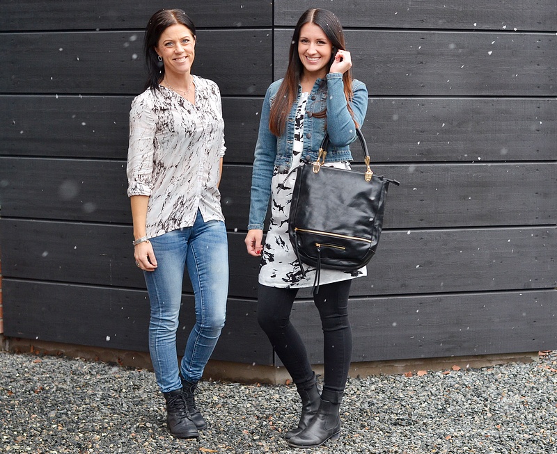 Ja snöflingorna föll vackert här när vi fotade dagensfotot här;) * Jag har på mig fina marmorerade blusen "Celika 3" och suveräna "Olivia Denim New"-jeansen. * Jennifer har på sig superfina tunikan "Chalena 3"-tunikan som också är med trendigt marmorerat print, snygga korta denimjackan "Vmblue" och väskan "Pc Jorgie" som alla kommer i dag.