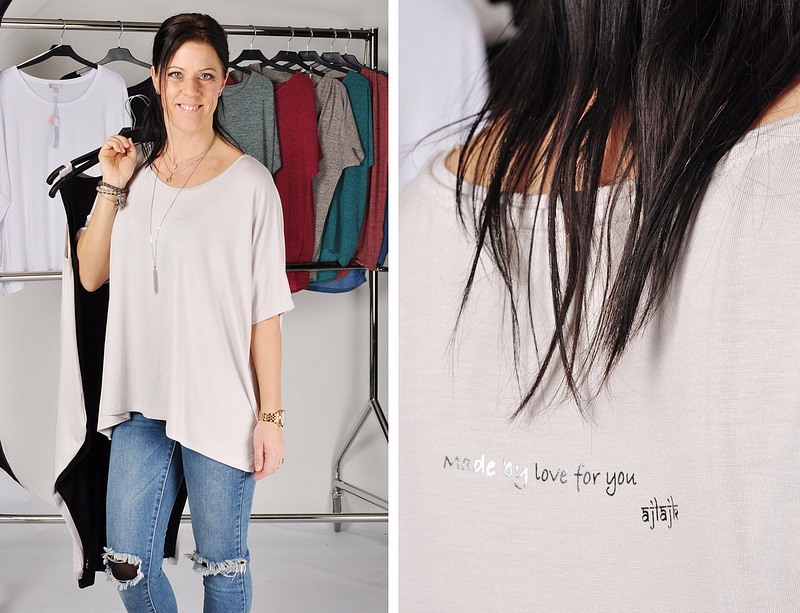 Ja i dag hoppas jga ni är med här nu kl 11:00 för nu kommer två helt underbara modeller från Ajlajks sommarkollektion. Jag själv har redan norpat toppen här och funderar även på klänningen som jag håller i, bägge modellerna har fin text på ryggen som ger det där lilla extra. Det är one size på toppen så det är en underbar oversizemodell med skön tyngd i som faller snyggt.