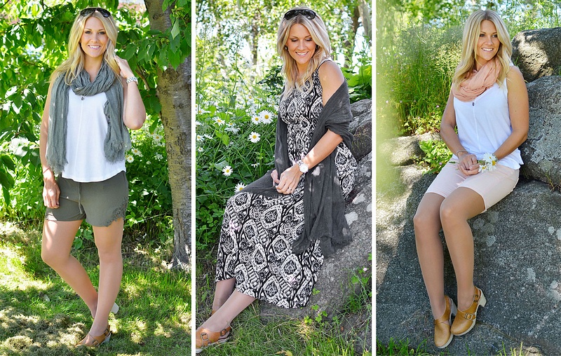 Ja dagens fina sjal är helt suverän då den går att variera och ha på olika sätt. Här visar Therese de tre olika färgerna tillsammans med plagg som vi har inne nu: Först ser ni fina shortsen "OnlCherry" tillsammans med nya Ajlajk-linnet som kom i går (påfyllning inom kort då det sålde snabbt), sjalen är i army samma som på shortsen. I mitten har Therese storsäljaren "Easy Maxi"-klänningen i paisleyprint tillsammans med sjalen i svart. På högra bilden ser ni suveräna "Linda Canvas"-shortsen i rosa tillsammans med Ajlajk-linnet och sjalen i aprikost.