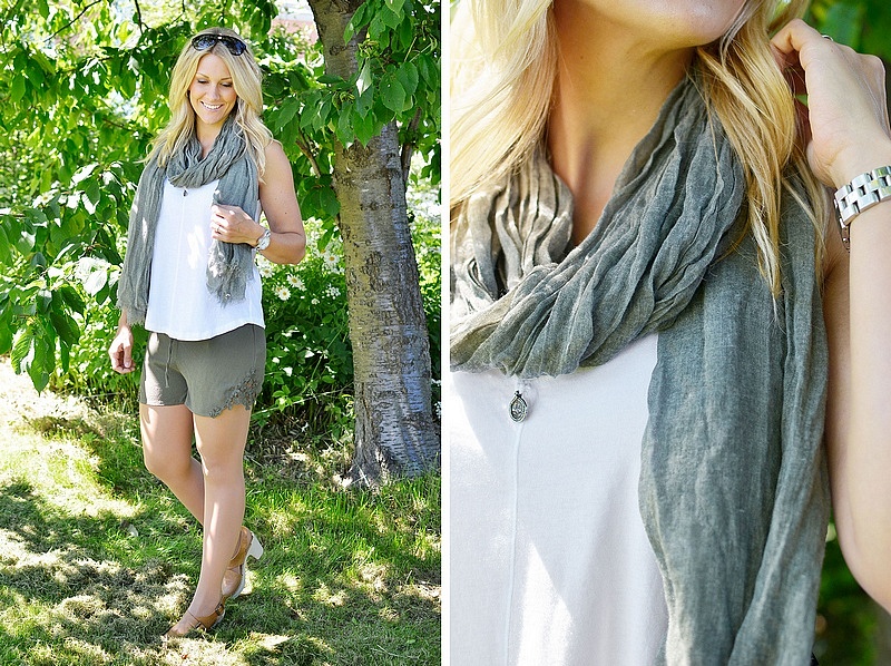 Jag har på mig sköna jeans-shortsen "Vihipsta" från Vila, suveräna linnet "Onlcalli", Ajlajk-halsbandet "J3" och nya sjalen.