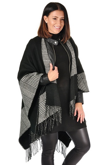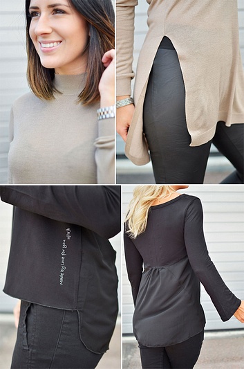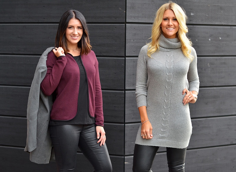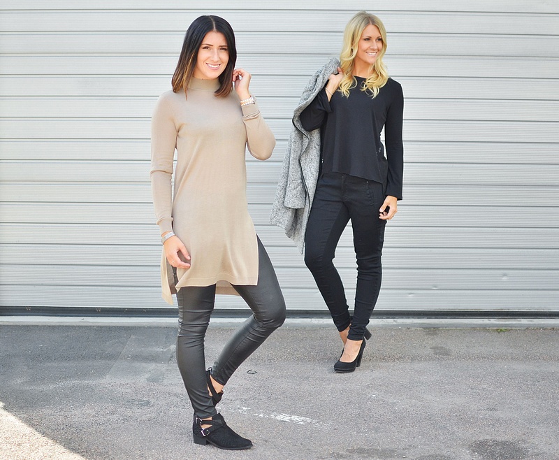 Jennifer har fina turtleneck-tröjan som ni ser coola sprunden på här och under de coola leggingsen i fakeskinn som har en skön bred resår i midjan så de sitter bra på. Therese har den fantastiskt fina Ajlajk-toppen med vackert skirt chiffongtyg över ryggen. Ponchon här är vändbar, ni ser mer av den på webshoppen nu.
