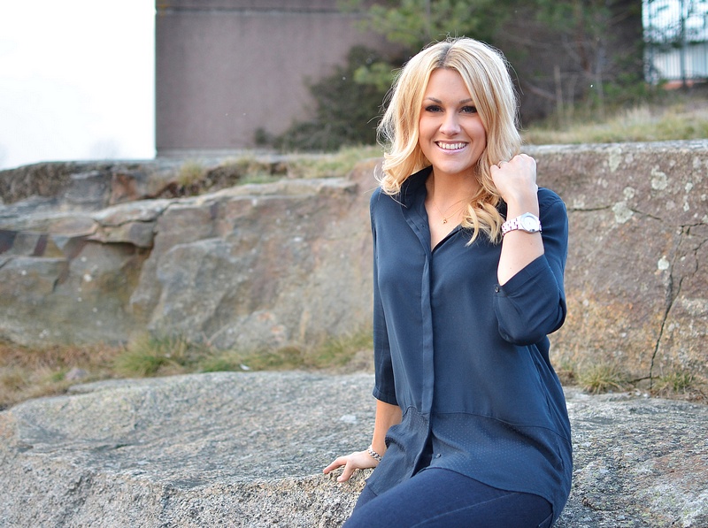 Jag har på mig favvobyxan "OnlRoyal Reg Zip" och suveräna Vila-toppen "Viran" som även finns som klänning. Armband och halsband är från Orelia.