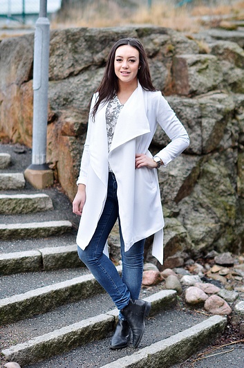 Nu närmar vi oss våren och en jacka som vi längtar efter att använda är snygga jackan "Bandit". Till denna har Elin på sig halsduken "Kial" och de sköna byxorna "Onlkendell".