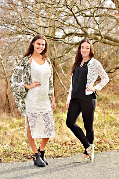 Ja nu skiner solen på oss och då passar det ju bra att visa dagens fina vårplagg här: * Amanda har på sig fina spetsklänningen som kommer i dag i vitt och i en fin mörk korallnyans. Över har hon coola Object-kimonon "ObjNevada" i det trendiga paisleyprintet. * Elin har på sig superfina bomberjackan i skir spets tillsammans med ärmlösa Vila-toppen och nya färgen på "Haisha"-espadrillos som är i blå denim med guldskimmmer (jag har såklart redan norpat dom själv).