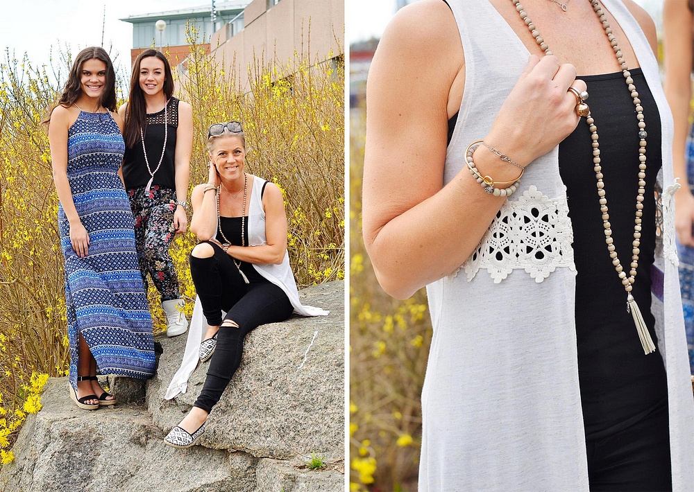 Ja jag hoppas ni har börjat få vårvärme för det är så många härliga plagg som kommer in här dagligen i somriga fina print. * Amanda visar nytt print på suveräna maxiklänningen "OnlNova" som sitter sååå snyggt på då det bara är ett tunt band över axlarna som man själv knyter och därmed påverkar längden lite. * Elin har på sig härliga OnlFloella-printet på nya byxan, linnet är från soya och halsbandet från Ajlajk - allt kommer upp nu kl 11:00. * Jag har på mig nya långvästen som är såååå fin med spetsen som går runt om, halsbandet och armbandet är nya från Ajlajk och komme rockså i dag. Byxan är storsäljaren "OnlRoyal Reg kneecut".