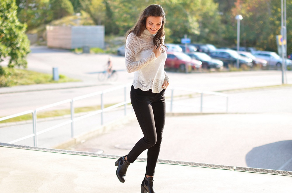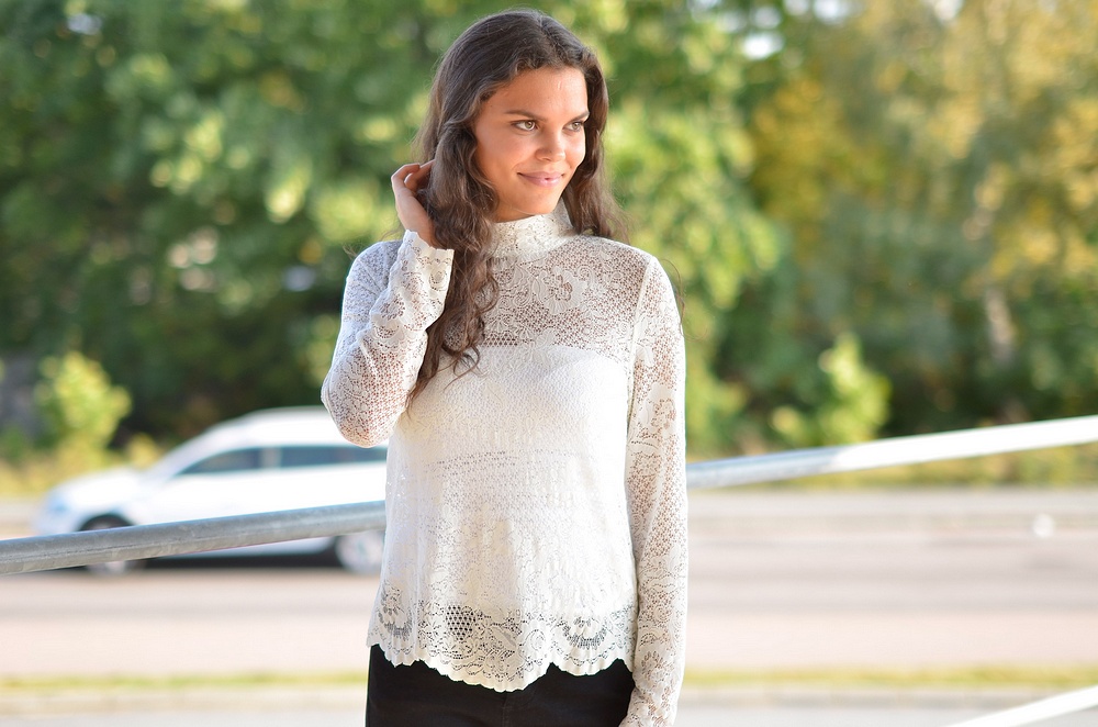 Här ser ni nya färgen på trendiga skira spetsblusen från Vila som kommer upp i dag. Jeansen är suveräna modellen "ObjAnifitally" från Object som nu kommer i svart i dag.