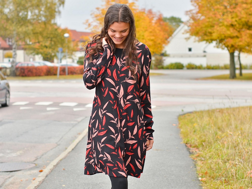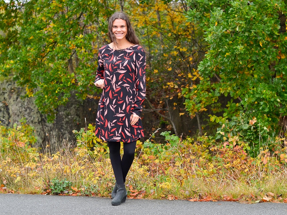 Amanda har på sig superfina Vila-klänningen som kommer i dag i härligt mönster med färger som lyser upp fint i höstmörkret - perfekt nu och självklart till julens alla fester. Fina långa halsbandet är från Edblad i "Divine"-serien och kommer också nu och lika så de sköna fleecefodrade strumpbyxorna som hon har här.