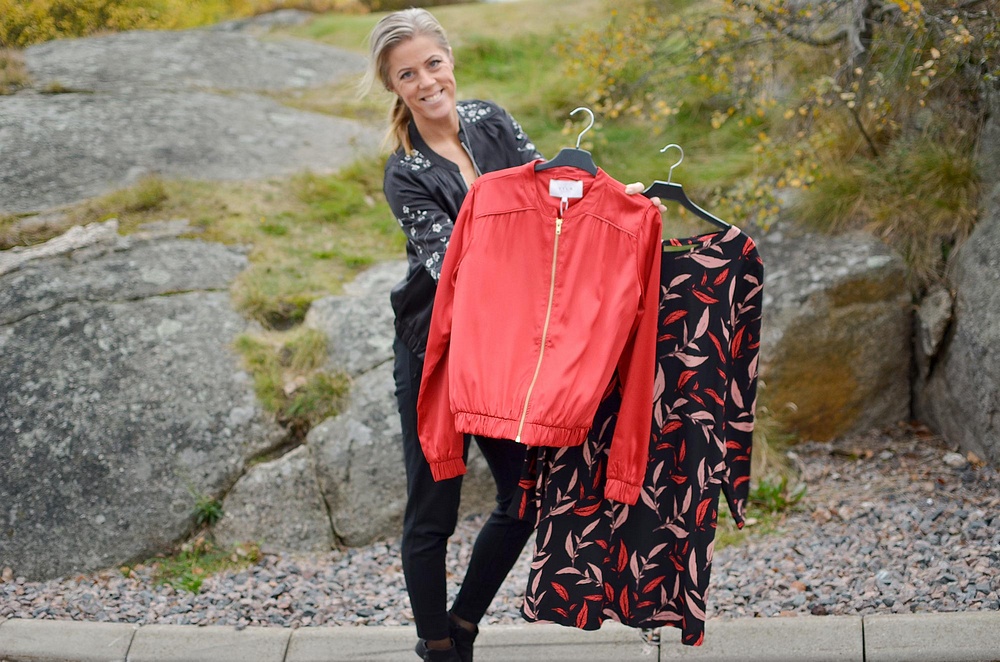 Ja lite blåsig dagens så det var inte helt lätt att få till en skarp dagensbild här men ni ser iaf de suuuperfina plaggen jag håller i här som ni bara inte får missa. Fantastiskt fin mönstrad klänning från Vila som är perfekt nu och självklart till julfesterna och julafton - sitter sååå snyggt på. I dag kommer äntligen storsäljaren "ViCentri" i rött och detta är allt jag fått tag på så se till att vara snabba och norpa den nu kl 11:00. Massa fina plagg kommer idag och omtyckta Kental (som är fleecefodrad) kommer som strumpbyxa i dag och det är ju perfekt i höstkylan nu. Jag har på mig OnlPopTrash-byxan, linnet "ViFalls"-linnet och suveräna "VmTokyo".